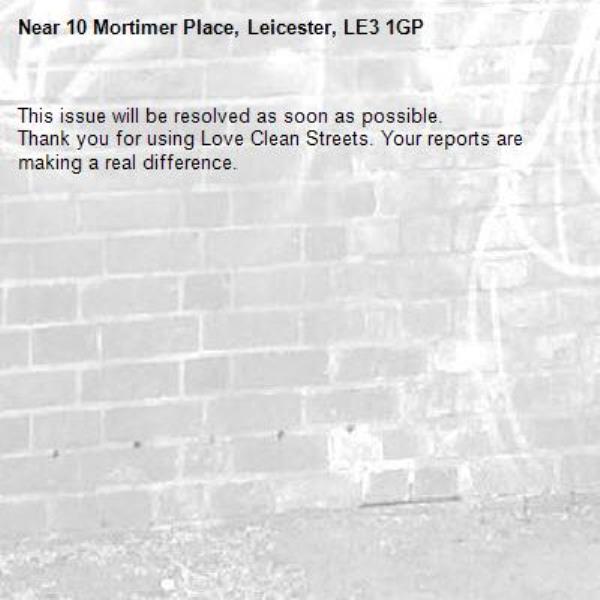 -10 Mortimer Place, Leicester, LE3 1GP 30/03/2026 07:25 This issue will be resolved as soon as possible. Thank you for using Love Clean Streets. Your reports are making a real difference.