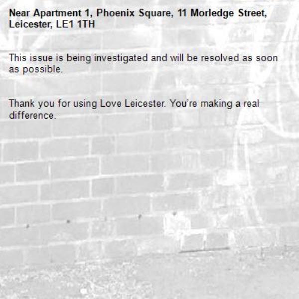 -Apartment 1, Phoenix Square, 11 Morledge Street, Leicester, LE1 1TH 28/01/2026 10:02 This issue is being investigated and will be resolved as soon as possible.