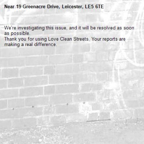 -19 Greenacre Drive, Leicester, LE5 6TE 10/03/2026 08:48 We’re investigating this issue, and it will be resolved as soon as possible. Thank you for using Love Clean Streets. Your reports are making a real difference.