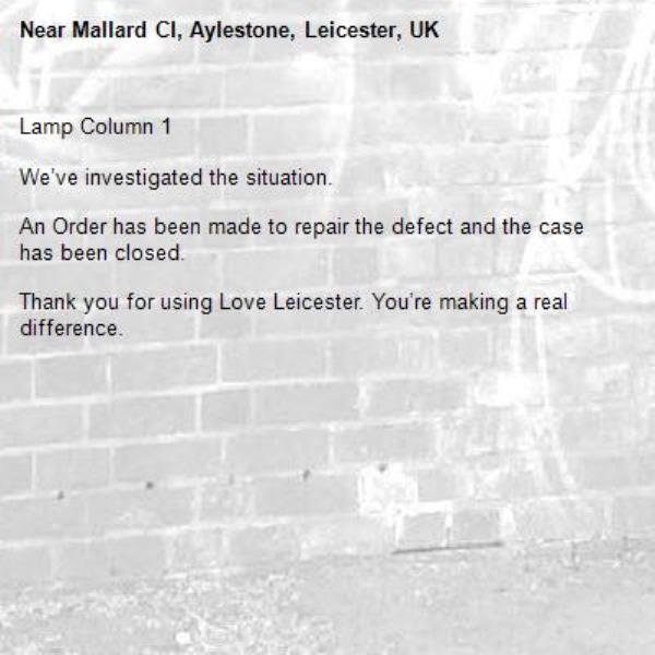 -Mallard Cl, Aylestone, Leicester, UK 05/01/2026 12:54 Lamp Column 1 We’ve investigated the situation. An Order has been made to repair the defect and the case has been closed. Thank you for using Love Leicester. You’re making a real difference.