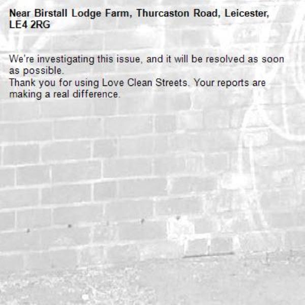 -Birstall Lodge Farm, Thurcaston Road, Leicester, LE4 2RG 24/12/2025 09:09 We’re investigating this issue, and it will be resolved as soon as possible. Thank you for using Love Clean Streets. Your reports are making a real difference.