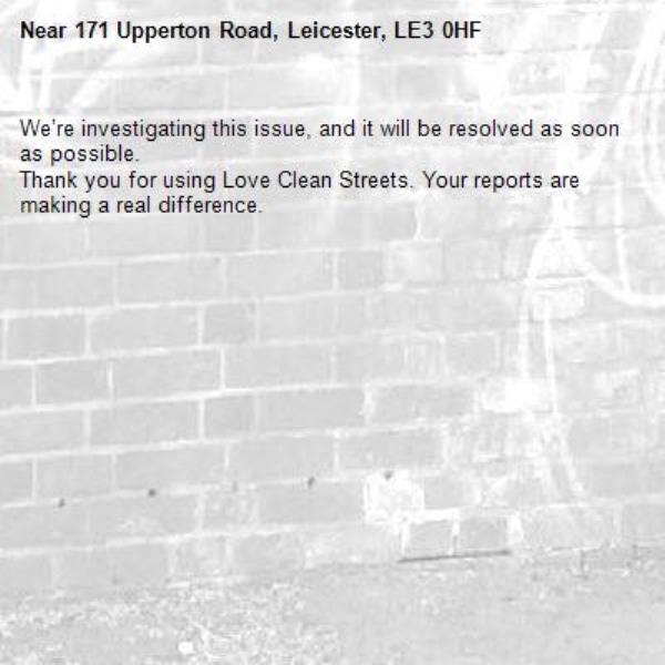 -171 Upperton Road, Leicester, LE3 0HF 27/11/2025 12:42 We’re investigating this issue, and it will be resolved as soon as possible. Thank you for using Love Clean Streets. Your reports are making a real difference.
