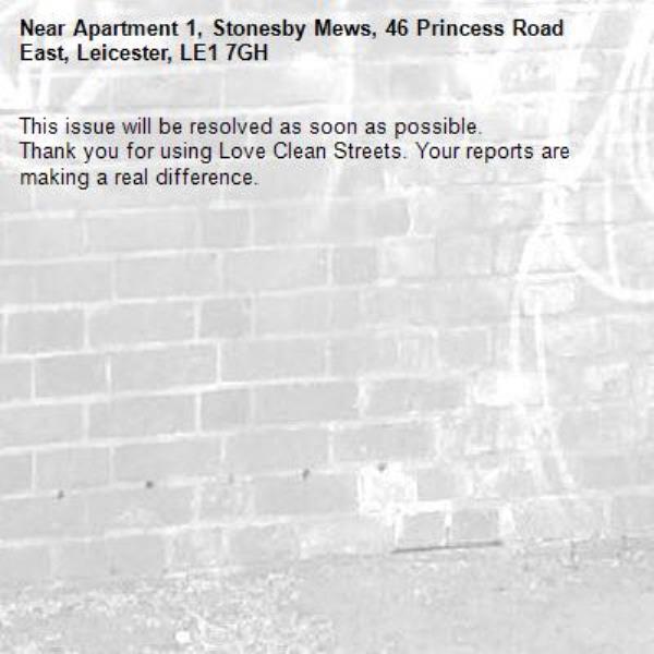 -Apartment 1, Stonesby Mews, 46 Princess Road East, Leicester, LE1 7GH 23/12/2025 07:35 This issue will be resolved as soon as possible. Thank you for using Love Clean Streets. Your reports are making a real difference.