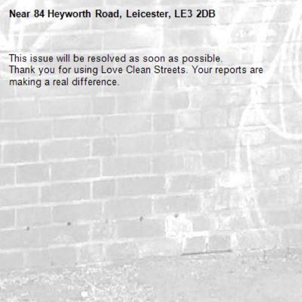 -84 Heyworth Road, Leicester, LE3 2DB 15/04/2026 11:08 This issue will be resolved as soon as possible. Thank you for using Love Clean Streets. Your reports are making a real difference.