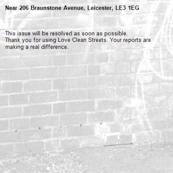 -206 Braunstone Avenue, Leicester, LE3 1EG 08/04/2026 14:42 This issue will be resolved as soon as possible. Thank you for using Love Clean Streets. Your reports are making a real difference.