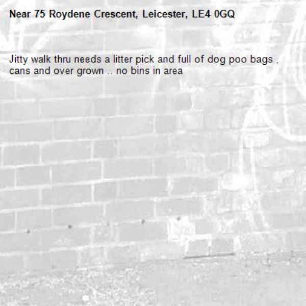 Jitty walk thru needs a litter pick and full of dog poo bags , cans and over grown .. no bins in area