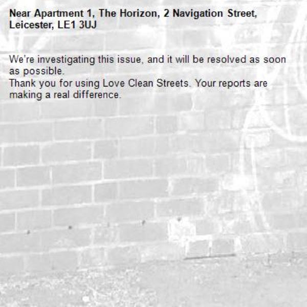 -Apartment 1, The Horizon, 2 Navigation Street, Leicester, LE1 3UJ 08/04/2026 14:20 We’re investigating this issue, and it will be resolved as soon as possible. Thank you for using Love Clean Streets. Your reports are making a real difference.