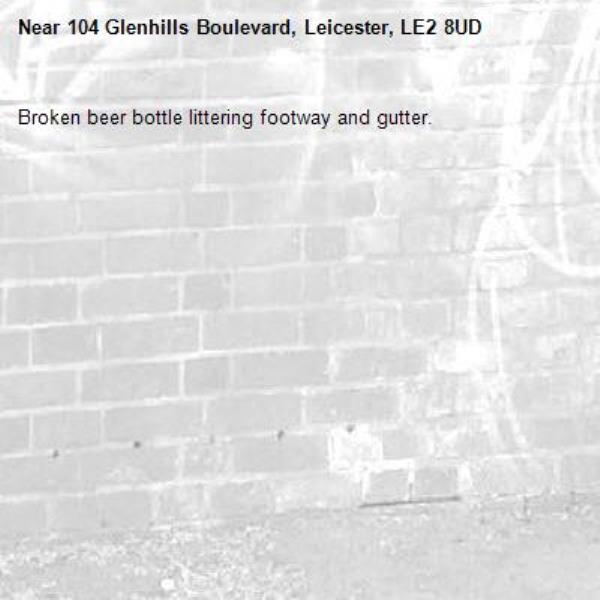 Broken beer bottle littering footway and gutter.