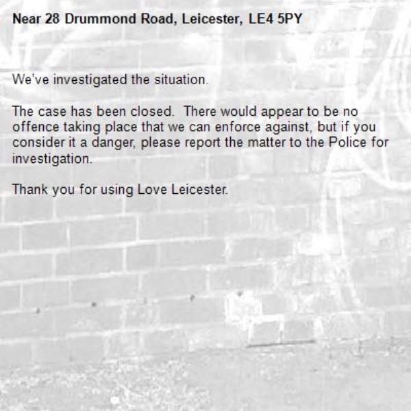 -28 Drummond Road, Leicester, LE4 5PY 26/11/2025 16:49 We’ve investigated the situation. The case has been closed. There would appear to be no offence taking place that we can enforce against, but if you consider it a danger, please report the matter to the Police for investigation. Thank you for using Love Leicester.