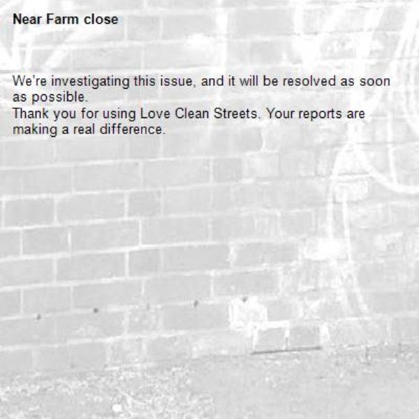 -Farm close 20/10/2025 08:17 We’re investigating this issue, and it will be resolved as soon as possible. Thank you for using Love Clean Streets. Your reports are making a real difference.