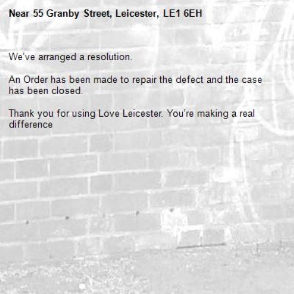 -55 Granby Street, Leicester, LE1 6EH 01/04/2026 12:49 We’ve arranged a resolution. An Order has been made to repair the defect and the case has been closed. Thank you for using Love Leicester. You’re making a real difference