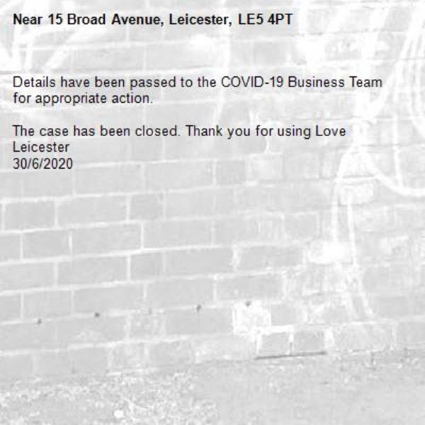 30/6/2020-15 Broad Avenue, Leicester, LE5 4PT 30/06/2020 14:31 Details have been passed to the COVID-19 Business Team for appropriate action. The case has been closed. Thank you for using Love Leicester 30/6/2020