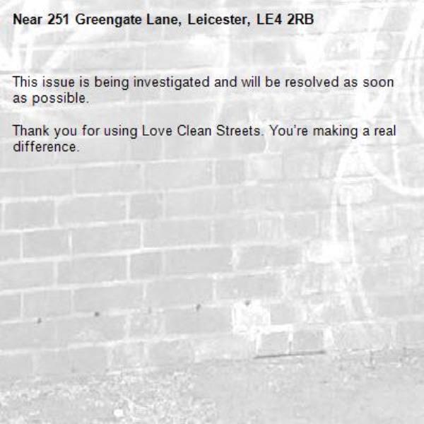 -251 Greengate Lane, Leicester, LE4 2RB 20/01/2026 10:16 This issue is being investigated and will be resolved as soon as possible. Thank you for using Love Clean Streets. You’re making a real difference.