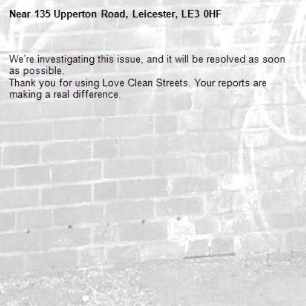 -135 Upperton Road, Leicester, LE3 0HF 05/03/2026 07:30 We’re investigating this issue, and it will be resolved as soon as possible. Thank you for using Love Clean Streets. Your reports are making a real difference.