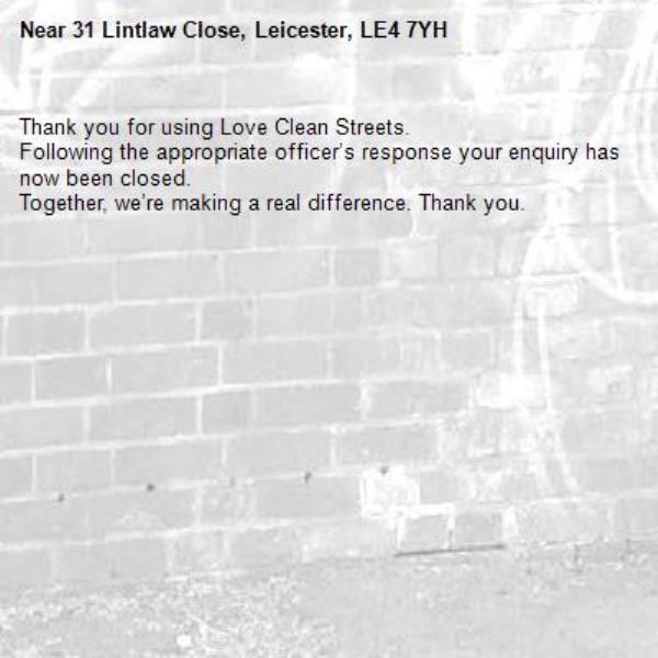 -31 Lintlaw Close, Leicester, LE4 7YH 03/11/2025 07:54 Thank you for using Love Clean Streets.