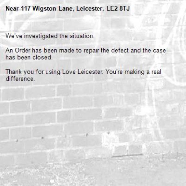 -117 Wigston Lane, Leicester, LE2 8TJ 22/12/2025 11:03 We’ve investigated the situation. An Order has been made to repair the defect and the case has been closed. Thank you for using Love Leicester. You’re making a real difference.