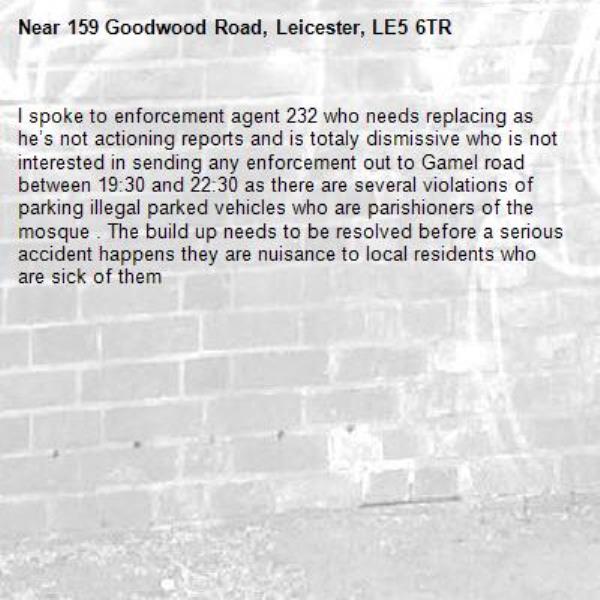 I spoke to enforcement agent 232 who needs replacing as he’s not actioning reports and is totaly dismissive who is not interested in sending any enforcement out to Gamel road between 19:30 and 22:30 as there are several violations of parking illegal parked vehicles who are parishioners of the mosque . The build up needs to be resolved before a serious accident happens they are nuisance to local residents who are sick of them