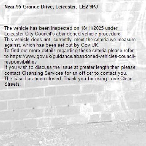 A red Vauxhall with no MOT has been left in Grange Drive LE2 9PJ. It has been left there for over 8 weeks.