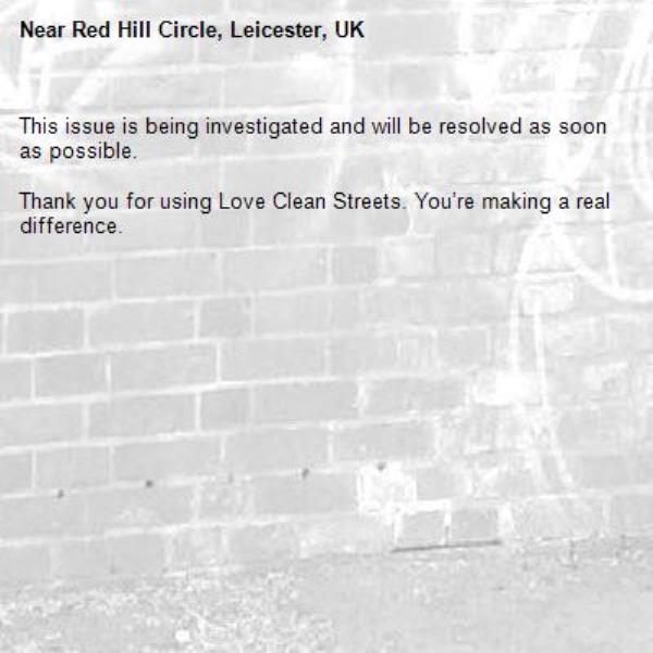 -Red Hill Circle, Leicester, UK 21/01/2026 10:13 This issue is being investigated and will be resolved as soon as possible. Thank you for using Love Clean Streets. You’re making a real difference.