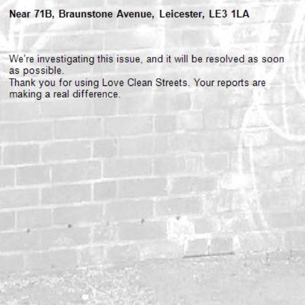 -71B, Braunstone Avenue, Leicester, LE3 1LA 08/04/2026 07:34 We’re investigating this issue, and it will be resolved as soon as possible. Thank you for using Love Clean Streets. Your reports are making a real difference.