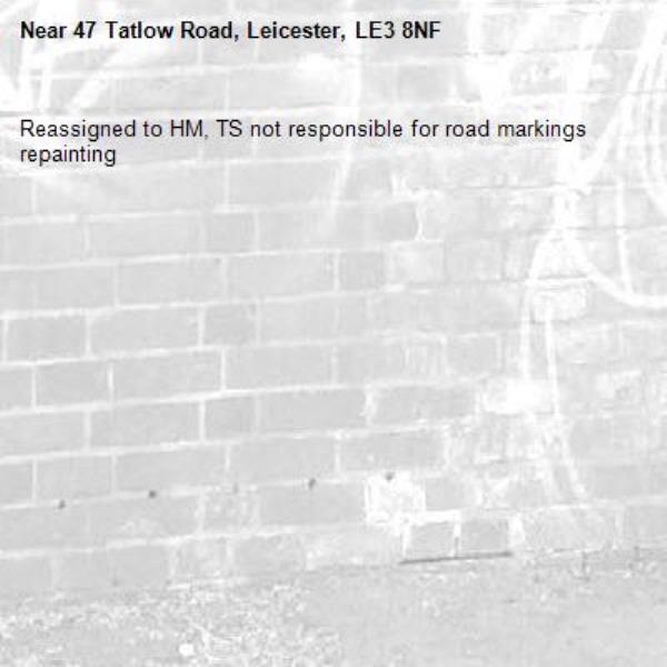 Reassigned to HM, TS not responsible for road markings repainting -47 Tatlow Road, Leicester, LE3 8NF 06/11/2025 11:45 Reassigned to HM, TS not responsible for road markings repainting