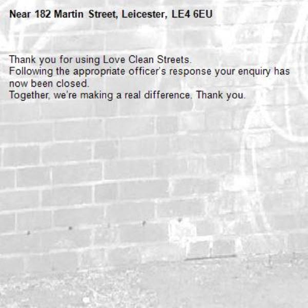 -182 Martin Street, Leicester, LE4 6EU 07/01/2026 08:51 Thank you for using Love Clean Streets.