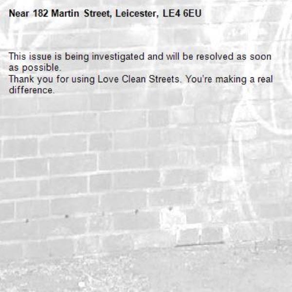 -182 Martin Street, Leicester, LE4 6EU 07/01/2026 08:50 This issue is being investigated and will be resolved as soon as possible. Thank you for using Love Clean Streets. You’re making a real difference.