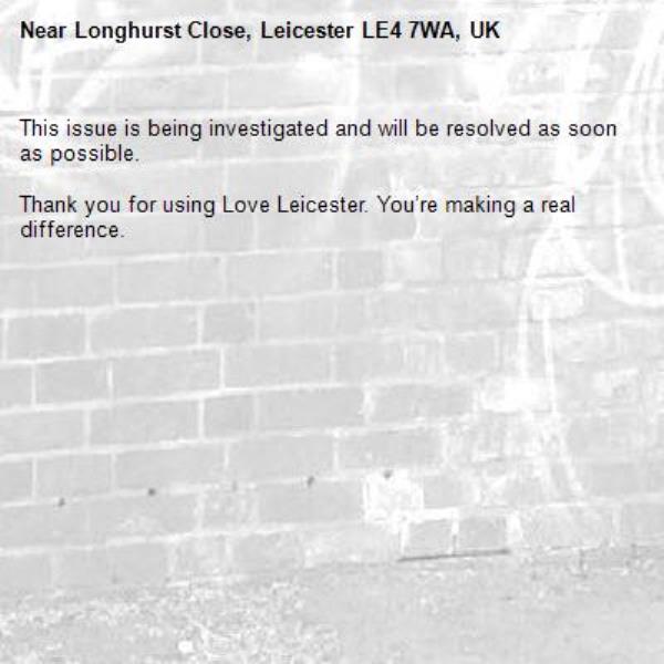 -Longhurst Close, Leicester LE4 7WA, UK 05/03/2026 15:19 This issue is being investigated and will be resolved as soon as possible. Thank you for using Love Leicester. You’re making a real difference.