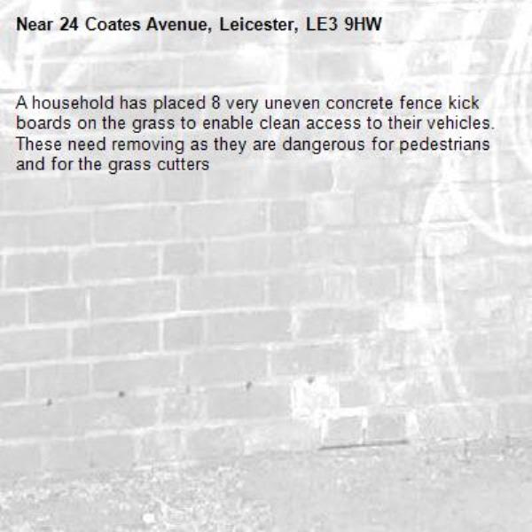 A household has placed 8 very uneven concrete fence kick boards on the grass to enable clean access to their vehicles. These need removing as they are dangerous for pedestrians and for the grass cutters