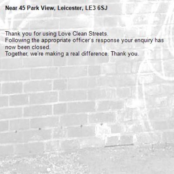 -45 Park View, Leicester, LE3 6SJ 03/02/2026 07:44 Thank you for using Love Clean Streets.