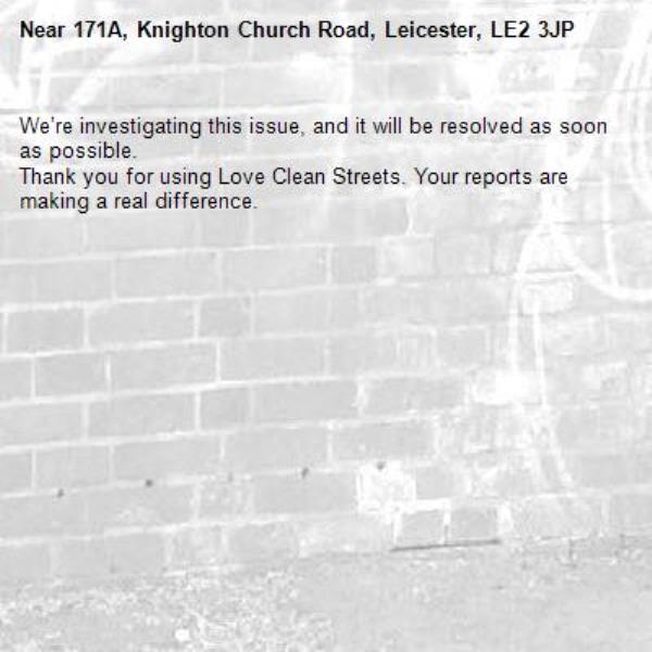 -171A, Knighton Church Road, Leicester, LE2 3JP 06/01/2026 09:59 We’re investigating this issue, and it will be resolved as soon as possible. Thank you for using Love Clean Streets. Your reports are making a real difference.