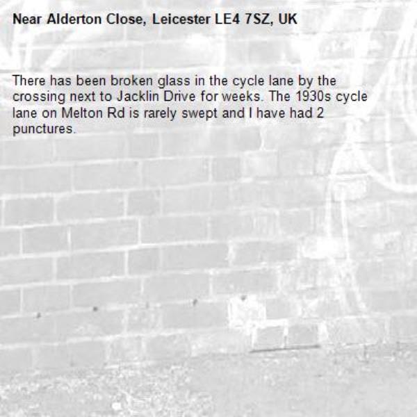 There has been broken glass in the cycle lane by the crossing next to Jacklin Drive for weeks. The 1930s cycle lane on Melton Rd is rarely swept and I have had 2 punctures.