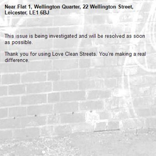 -Flat 1, Wellington Quarter, 22 Wellington Street, Leicester, LE1 6BJ 23/12/2025 10:43 This issue is being investigated and will be resolved as soon as possible. Thank you for using Love Clean Streets. You’re making a real difference.