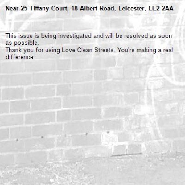 -25 Tiffany Court, 18 Albert Road, Leicester, LE2 2AA 21/10/2025 09:10 This issue is being investigated and will be resolved as soon as possible. Thank you for using Love Clean Streets. You’re making a real difference.
