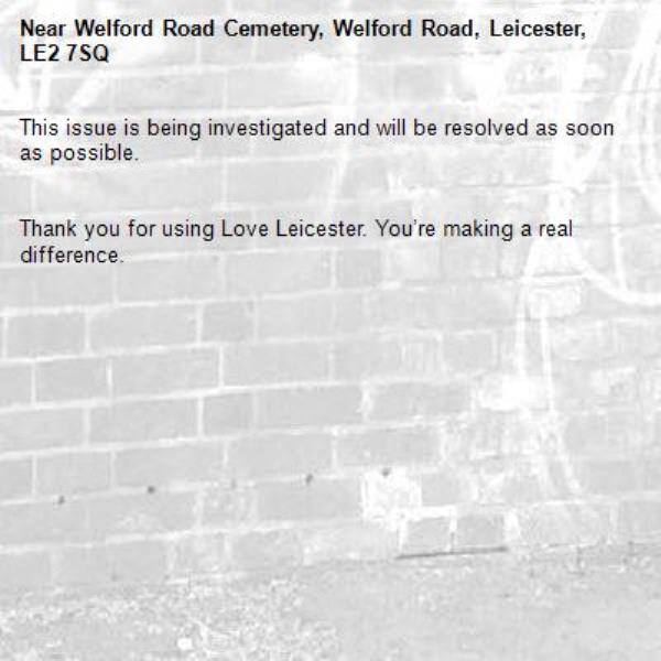 -Welford Road Cemetery, Welford Road, Leicester, LE2 7SQ 01/12/2025 08:41 This issue is being investigated and will be resolved as soon as possible.