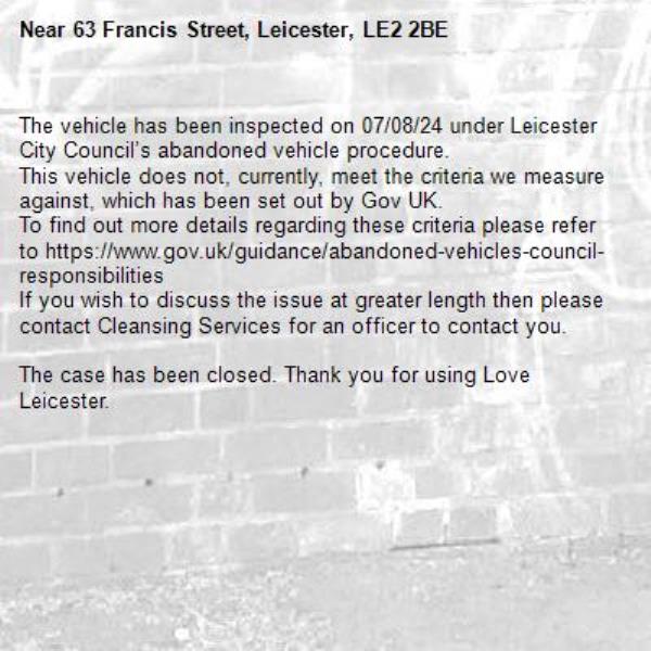 There is a blue Kia Picanto, registration LS59 ZXP, parked approximately outside number 63 Francis Street.