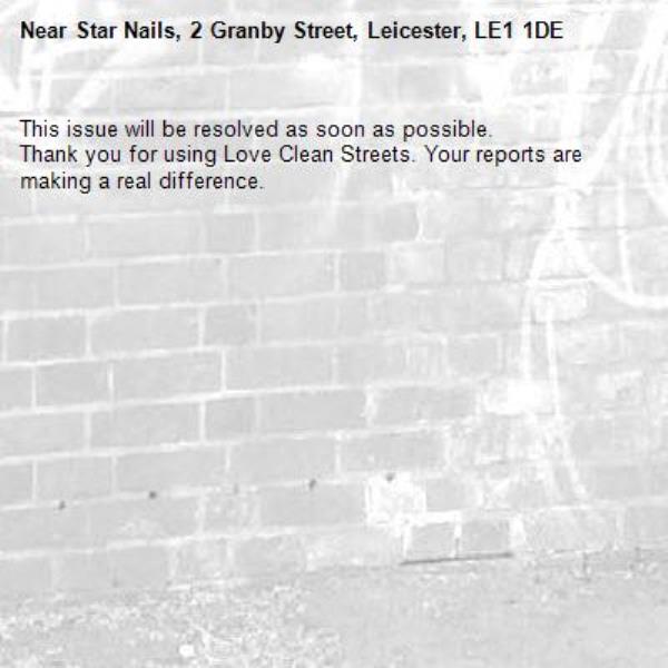 -Star Nails, 2 Granby Street, Leicester, LE1 1DE 24/10/2025 07:54 This issue will be resolved as soon as possible. Thank you for using Love Clean Streets. Your reports are making a real difference.