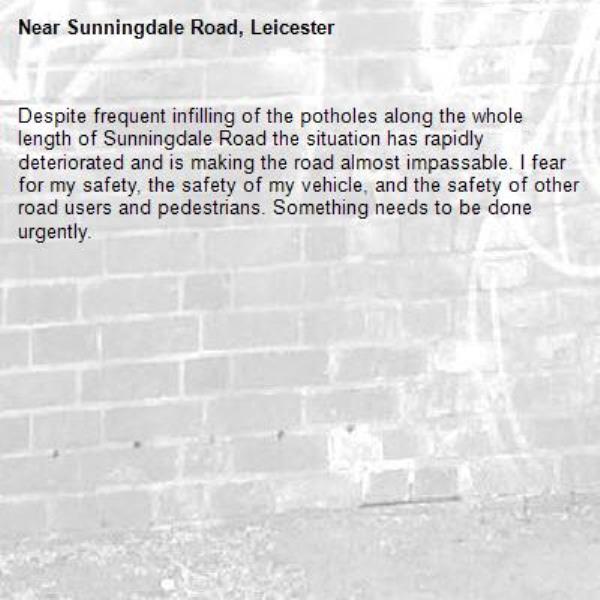 Despite frequent infilling of the potholes along the whole length of Sunningdale Road the situation has rapidly deteriorated and is making the road almost impassable. I fear for my safety, the safety of my vehicle, and the safety of other road users and pedestrians. Something needs to be done urgently.