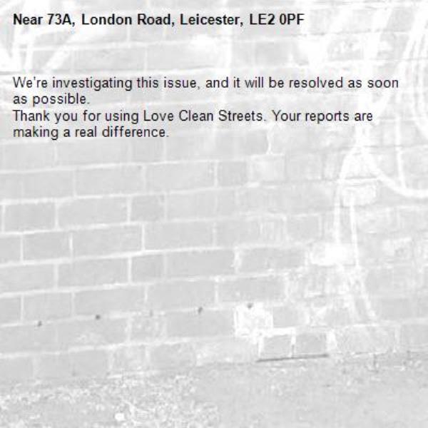 -73A, London Road, Leicester, LE2 0PF 07/01/2026 10:41 We’re investigating this issue, and it will be resolved as soon as possible. Thank you for using Love Clean Streets. Your reports are making a real difference.