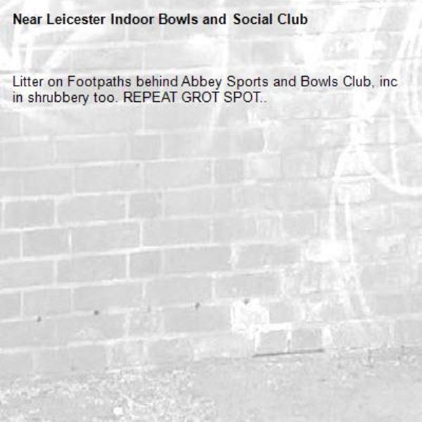 Litter on Footpaths behind Abbey Sports and Bowls Club, inc in shrubbery too. REPEAT GROT SPOT..