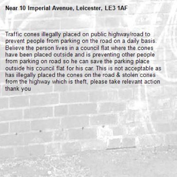 Traffic cones illegally placed on public highway/road to prevent people from parking on the road on a daily basis. Believe the person lives in a council flat where the cones have been placed outside and is preventing other people from parking on road so he can save the parking place outside his council flat for his car. This is not acceptable as has illegally placed the cones on the road & stolen cones from the highway which is theft, please take relevant action thank you