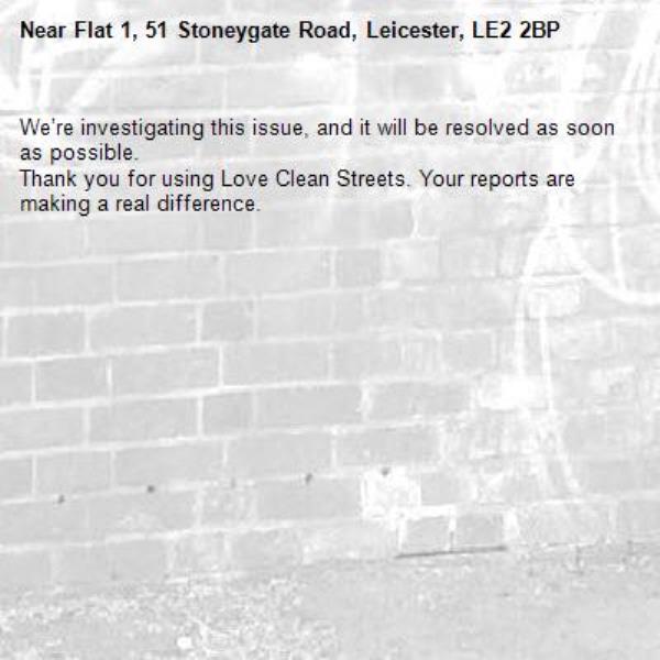 -Flat 1, 51 Stoneygate Road, Leicester, LE2 2BP 03/03/2026 13:12 We’re investigating this issue, and it will be resolved as soon as possible. Thank you for using Love Clean Streets. Your reports are making a real difference.