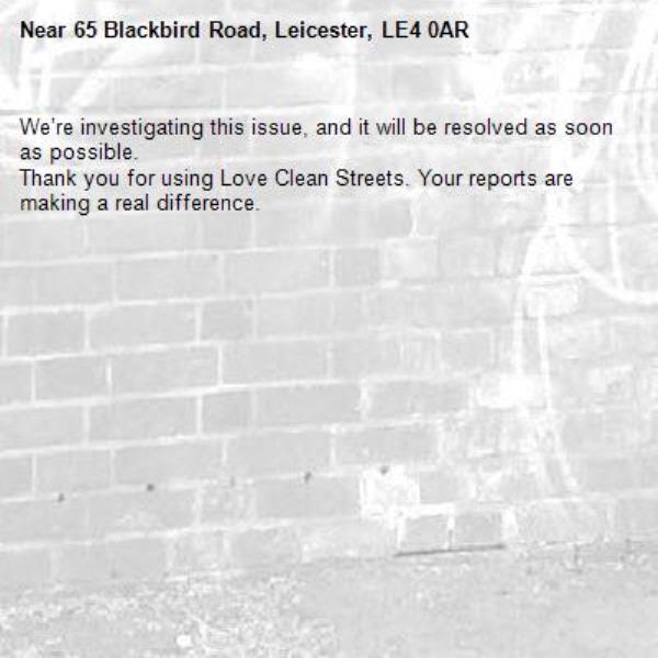 -65 Blackbird Road, Leicester, LE4 0AR 03/03/2026 13:11 We’re investigating this issue, and it will be resolved as soon as possible. Thank you for using Love Clean Streets. Your reports are making a real difference.