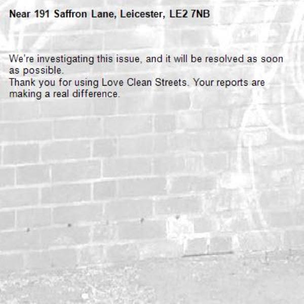 -191 Saffron Lane, Leicester, LE2 7NB 30/03/2026 13:02 We’re investigating this issue, and it will be resolved as soon as possible. Thank you for using Love Clean Streets. Your reports are making a real difference.