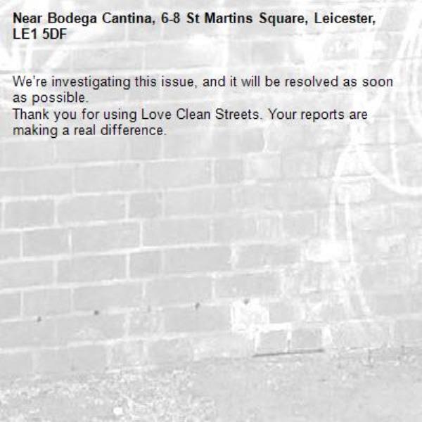 -Bodega Cantina, 6-8 St Martins Square, Leicester, LE1 5DF 17/12/2025 08:38 We’re investigating this issue, and it will be resolved as soon as possible. Thank you for using Love Clean Streets. Your reports are making a real difference.