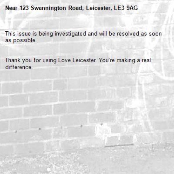 -123 Swannington Road, Leicester, LE3 9AG 04/04/2026 14:59 This issue is being investigated and will be resolved as soon as possible. Thank you for using Love Leicester. You’re making a real difference.