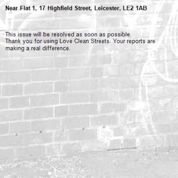 -Flat 1, 17 Highfield Street, Leicester, LE2 1AB 06/04/2026 16:02 This issue will be resolved as soon as possible. Thank you for using Love Clean Streets. Your reports are making a real difference.