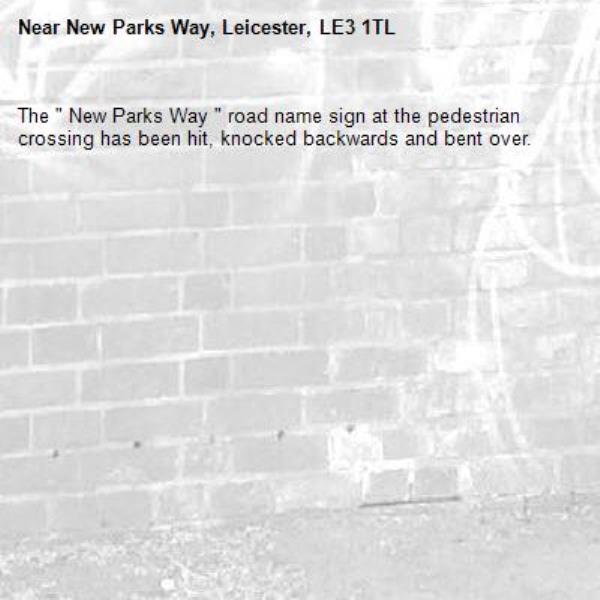 The " New Parks Way " road name sign at the pedestrian crossing has been hit, knocked backwards and bent over.