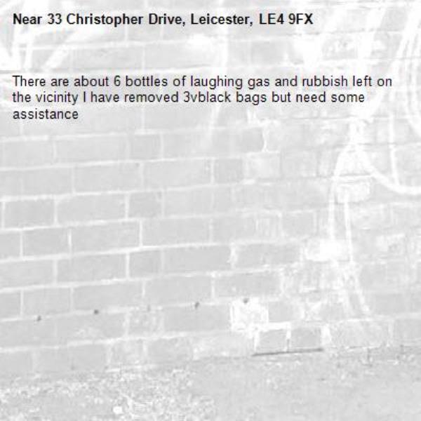There are about 6 bottles of laughing gas and rubbish left on the vicinity I have removed 3vblack bags but need some assistance