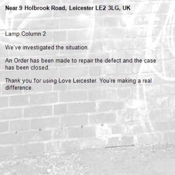 -9 Holbrook Road, Leicester LE2 3LG, UK 22/12/2025 12:21 Lamp Column 2 We’ve investigated the situation. An Order has been made to repair the defect and the case has been closed. Thank you for using Love Leicester. You’re making a real difference.